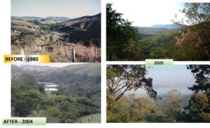 O que mais chamou a atenção na exposição de Guaraci foi a sequência de fotos aéreas do Sítio Duas Cachoeiras, tiradas ao longo dos anos. No início, sem vegetação nenhuma e, pouco a pouco, com a floresta predominando. Ele se recorda que, no início, o Sítio Duas Cachoeiras tinha apenas uma nascente. Atualmente, com a volta da mata nativa e a infiltração segura da água da chuva no solo, as nascentes já são quatro – comprovando que áreas cobertura florestal adequada também funcionam como armazenadoras e conservadoras de água.